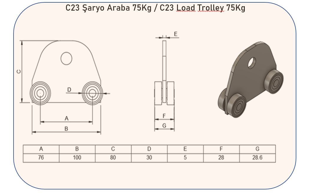 TR-- C-23 Şaryo arabaları, Natsu'ya ait vakumla kaldırma makinesi olan "Partner " in raylı bir sistemle hareket edebilmesi için tasarlanmıştır. Raylar üzerinde hareket eden ve yük taşıma amacıyla kullandığımız mekanik bir ekipmandır. Şaryolar, taşıma kapasiteleri ve kullanım kolaylıkları sayesinde özellikle ağır yüklerin güvenli bir şekilde taşınmasını mümkün kılar. EN-- C-23 trolleys are designed to allow 'Partner', a vacuum lifting machine belonging to Natsu, to move on a rail system. They are mechanical equipment that move on rails and are used for carrying loads. Thanks to their load-carrying capacity and ease of use, trolleys make it possible to transport heavy loads safely.